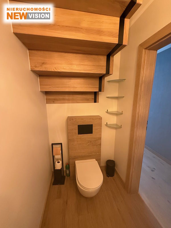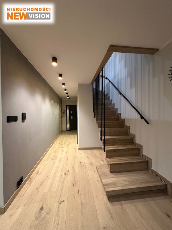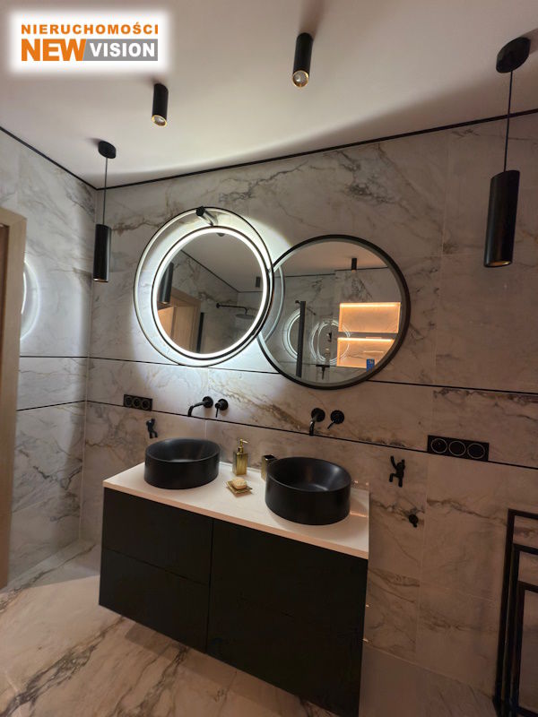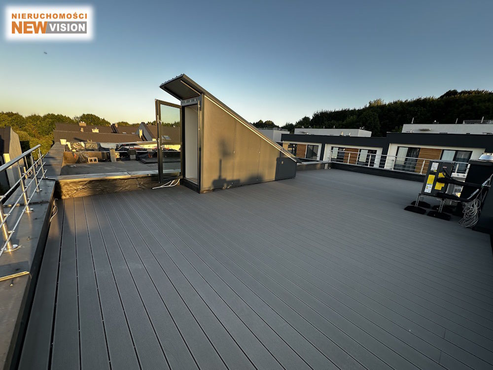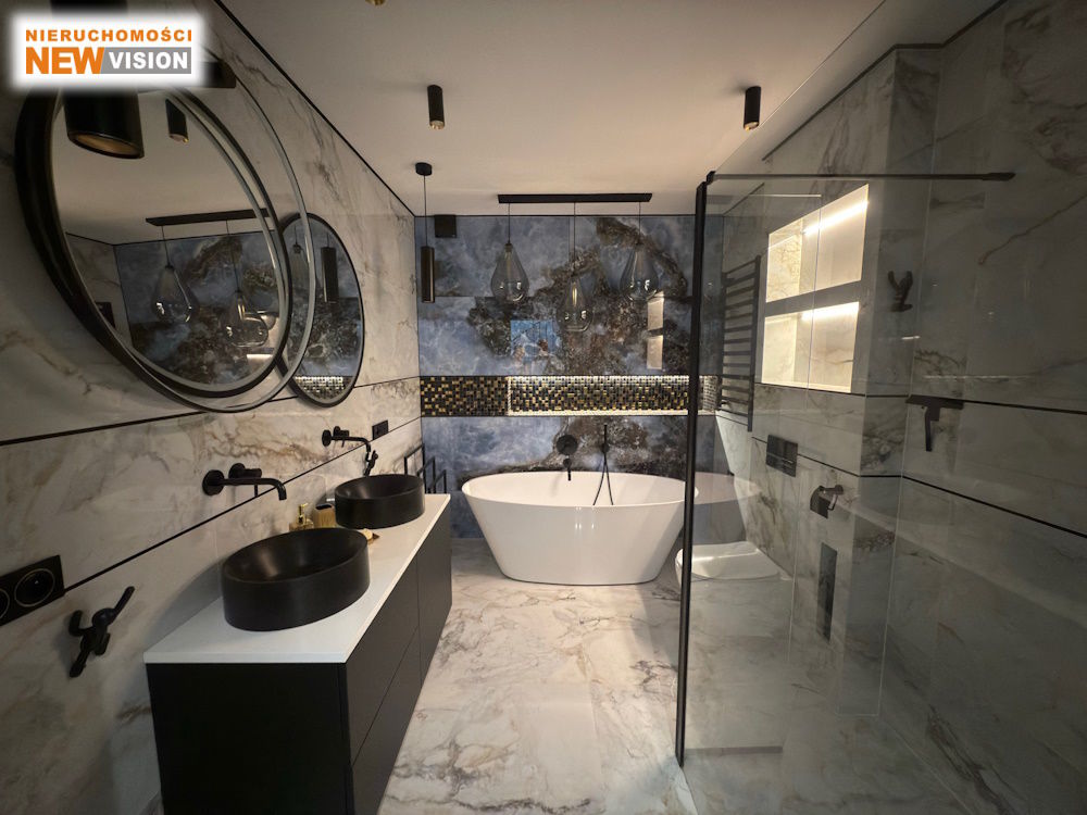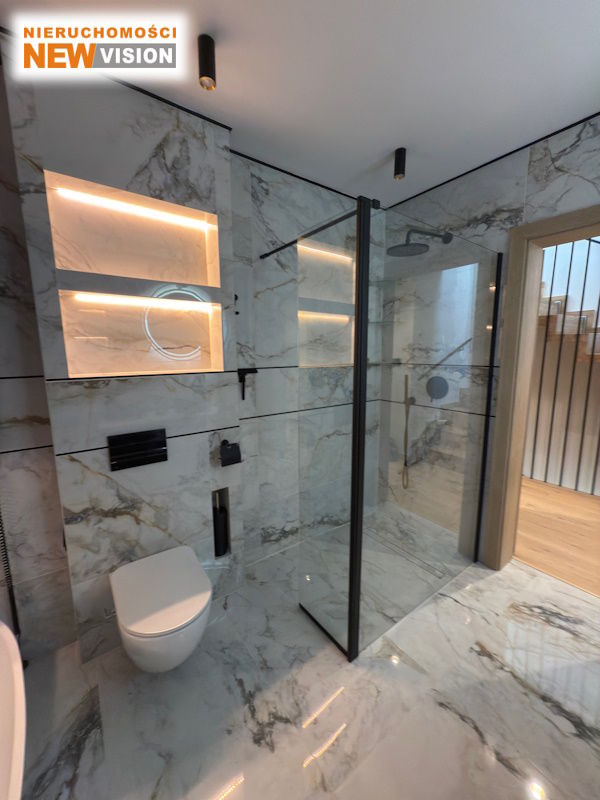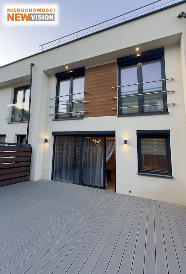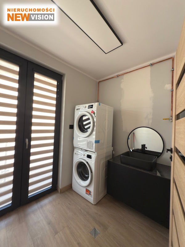 Na piętrze czekają trzy komfortowe sypialnie oraz duża, stylowa łazienka z WC. W łazience zastosowano piękne kafle o strukturze marmuru, podkreślając luksusowy charakter tego miejsca. Do dyspozycji jest wanna wolnostojąca, kabina prysznicowa, dwie umywalki oraz muszla podwieszana z bidetem. Dodatkowo, na tym poziomie znajduje się pralnia z suszarnią - w cenie nowa pralka i suszarka. Niezapomnianym atutem jest duży taras na dachu, idealny na letnie spotkania i relaks na świeżym powietrzu. Dach jest podwójnie izolowany, z odpływami. Drzwi wewnętrzne wysokiej klasy z firmy DRE. Dla większego komfortu mieszkańców zainstalowano w każdym pokoju klimatyzację, kamery ( 4 wewnętrzne i 4 zewnętrzne), zamontowany światłowód, żaluzje antywłamaniowe.