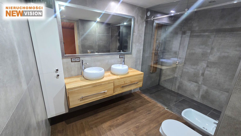 - Nowoczesną łazienkę z WC, prysznicem, bidetem i dwoma umywalkami (4,15 m²),