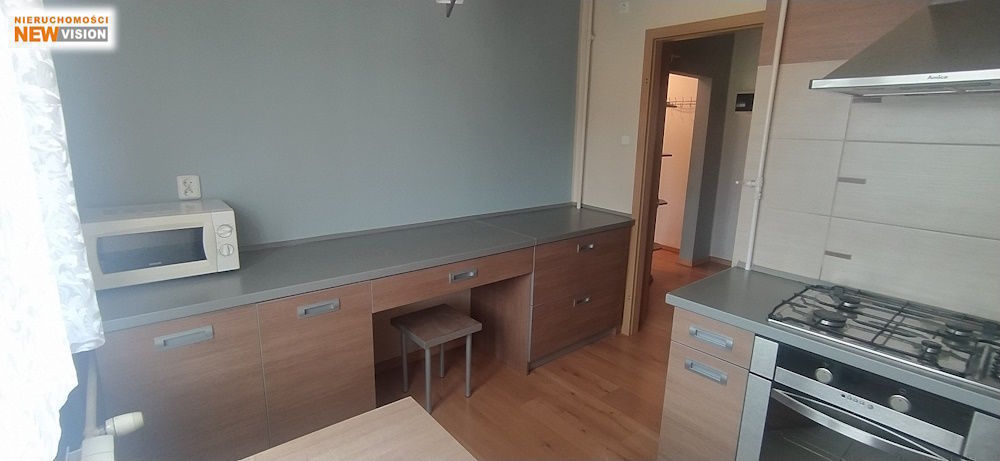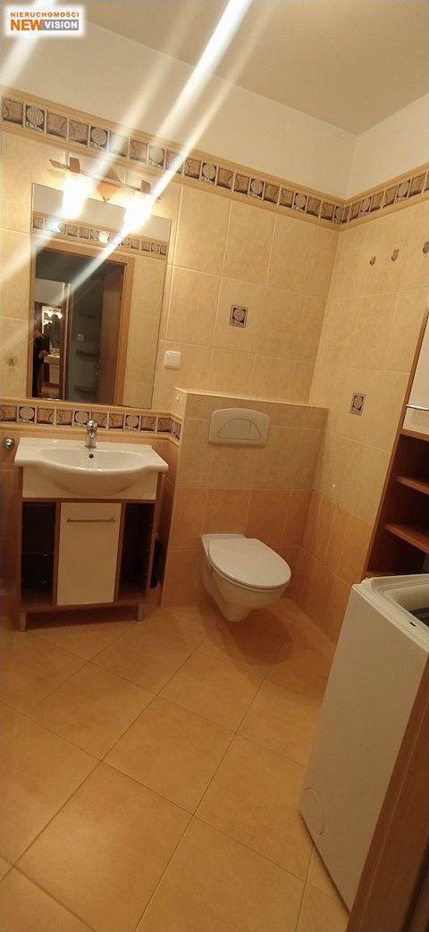 Przemyślana aranżacja kuchni obejmuje meble na wymiar, nowoczesną kuchenkę gazową, piekarnik elektryczny, zmywarkę oraz lodówkę, zapewniając komfort i wygodę codziennego użytkowania. W łazience znajduje się kabina prysznicowa, umywalka oraz pralka, co czyni to miejsce praktycznym i funkcjonalnym.